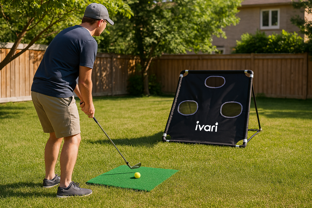Practice your chips and pitches with this portable cornhole-style Golf Chipping game. Manufactured from nylon and sturdy PVC pipes, you can set this up in your living room, backyard, or neighborhood park in minutes without tools. Includes 16 soft foam balls and a golf hitting mat to protect your surface, as well as a reusable scorecard for when the competition gets hot!